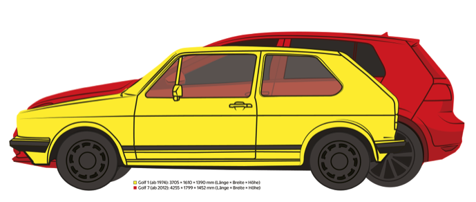 Das wundersame Wachstum lässt sich schön beim VW Golf verfolgen. Als er 1974 lanciert wurde, wog er knapp 800 Kilogramm und war 1 Meter 61 breit, 3 Meter 70 lang. Mit jeder Generation wurde es mehr, heute stehen wir bei der siebten. Sie ist deutlich grösser und mit 1,6 Tonnen doppelt so schwer. Weil der Golf immer grösser wurde, brachte VW mehrfach neue Kleinwagen heraus, den Polo etwa, der dann seinerseits stetig wuchs. Dass ein Nachfolgemodell kleiner ist als der Vorgänger, kommt fast nie vor. Und als zum Beispiel 2001 der Mini sein Comeback gab, konnte man sich die Frage stellen, warum der noch Mini hiess.