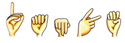 Das Fingeralphabet (unten) ist eine Ergänzung zur Gebärdensprache. Es kommt dann zum Zug, wenn für einen Begriff keine Gebärden existieren, vor allem bei Namen oder Fremdwörtern. Diese werden dann mit dem Fingeralphabet buchstabiert.